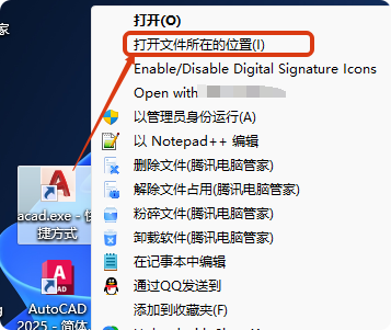 - 在桌面上右键点击 CAD 或 Excel/WPS 图标,选择“打开文件所在的位置”。